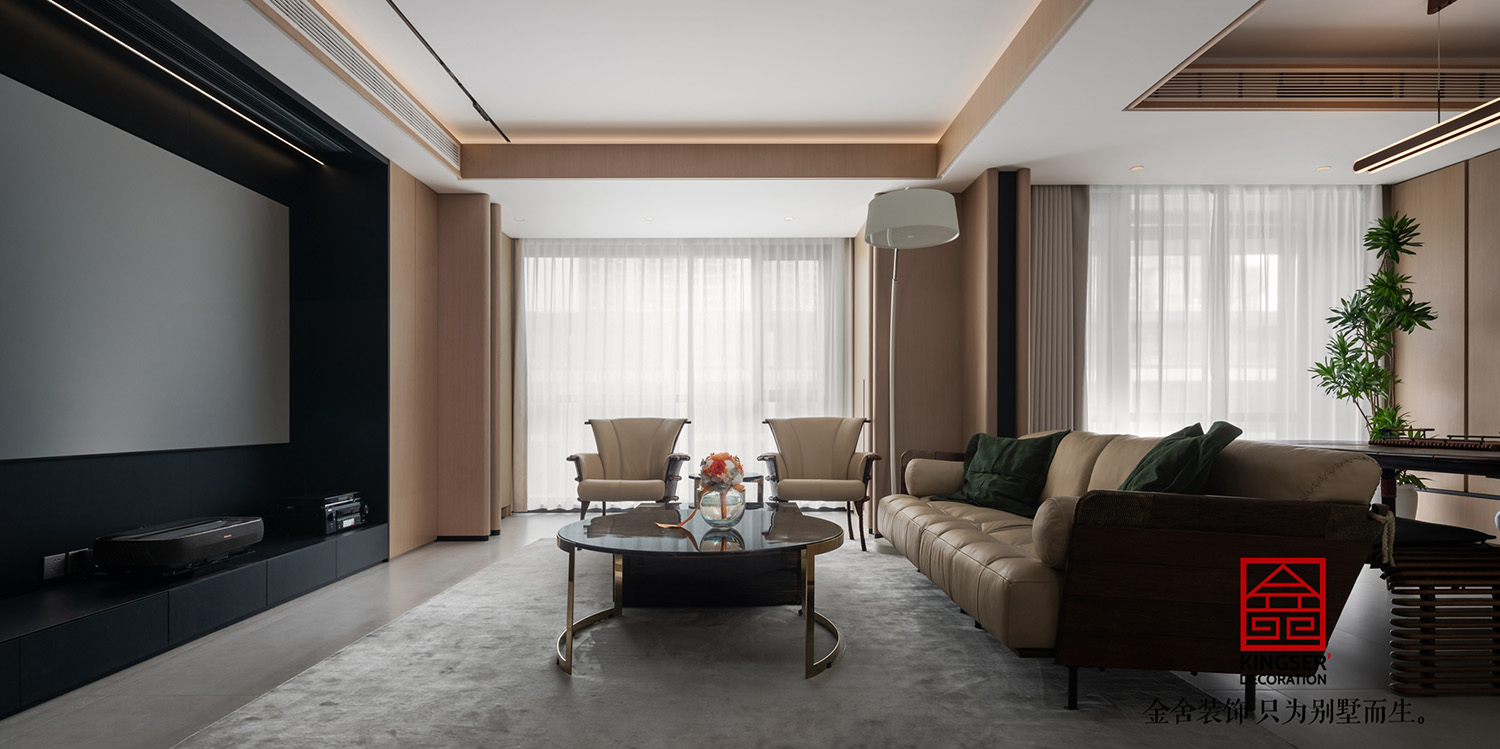 客廳采用磁吸軌道無主燈設計+定制燈帶,以舒適合理的線條,引領室內氛圍光,拉伸層高,擴充格局,讓業主真正感受私人訂制設計之美。